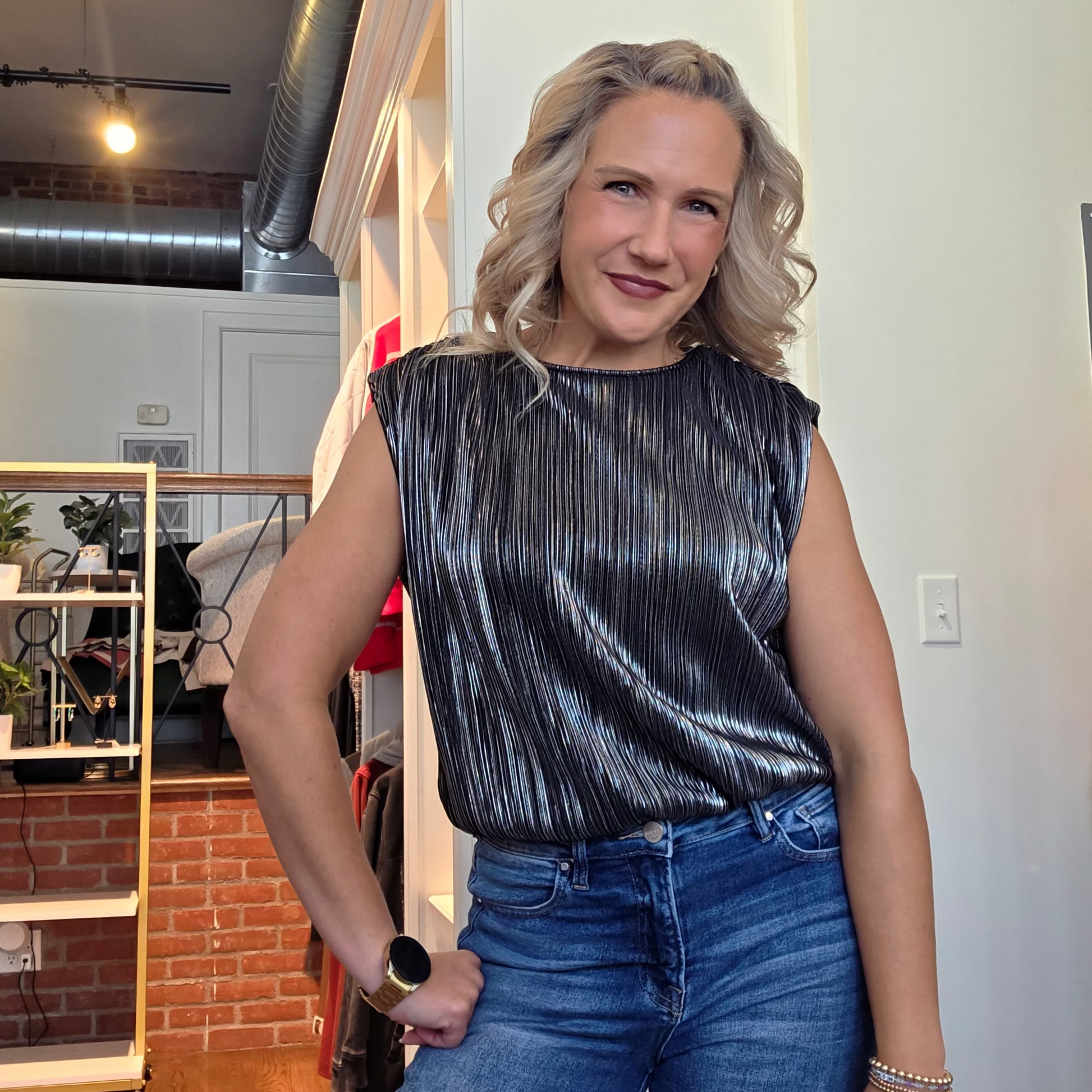 Make a statement in this gorgeous black and silver metallic pleated muscle top, designed with a chic bubble hem for added flair. Its shimmering finish catches the light beautifully, creating a striking look that stands out. Pair it with the matching pants for a coordinated ensemble that guarantees a show-stopping appearance wherever you go.