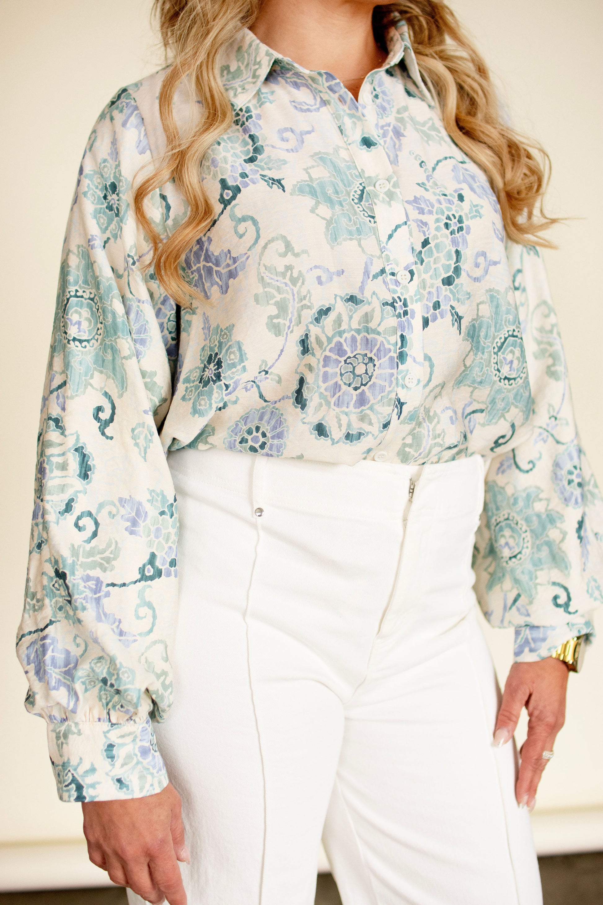 Bring effortless charm to your wardrobe with this delightful button-down top featuring a soft green and blue floral print that feels like springtime in fabric form. The romantic balloon sleeves add a whimsical touch that's equal parts fun and flattering, while the classic button-front design keeps things polished and versatile. Perfect for pairing with your favorite jeans, skirts, or trousers—this piece transitions seamlessly from casual coffee dates to weekend adventures. A playful staple that proves florals are always in season.