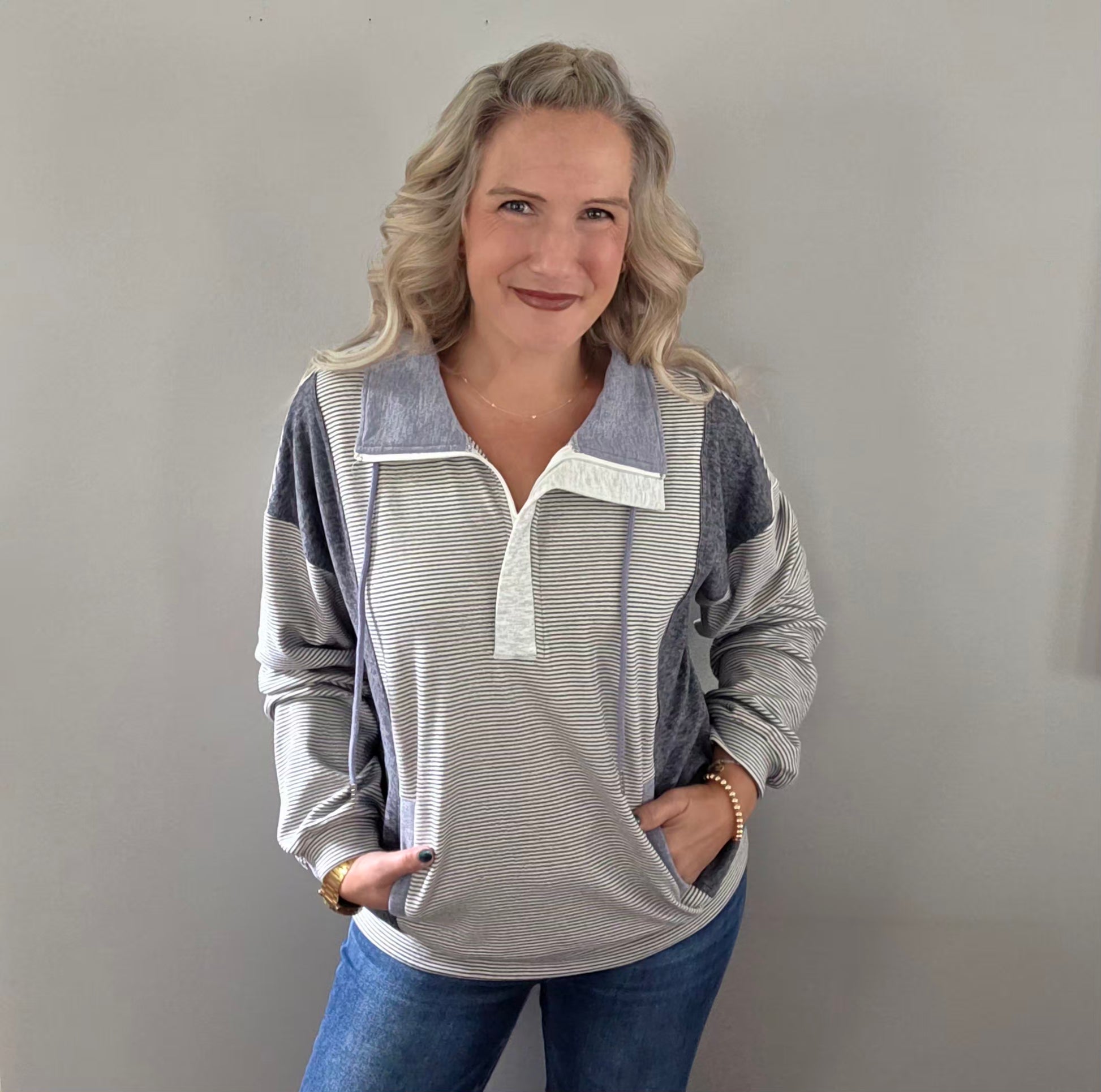 Super soft blue striped half zip pullover with front pockets. Relaxed fit. Wearing a large.