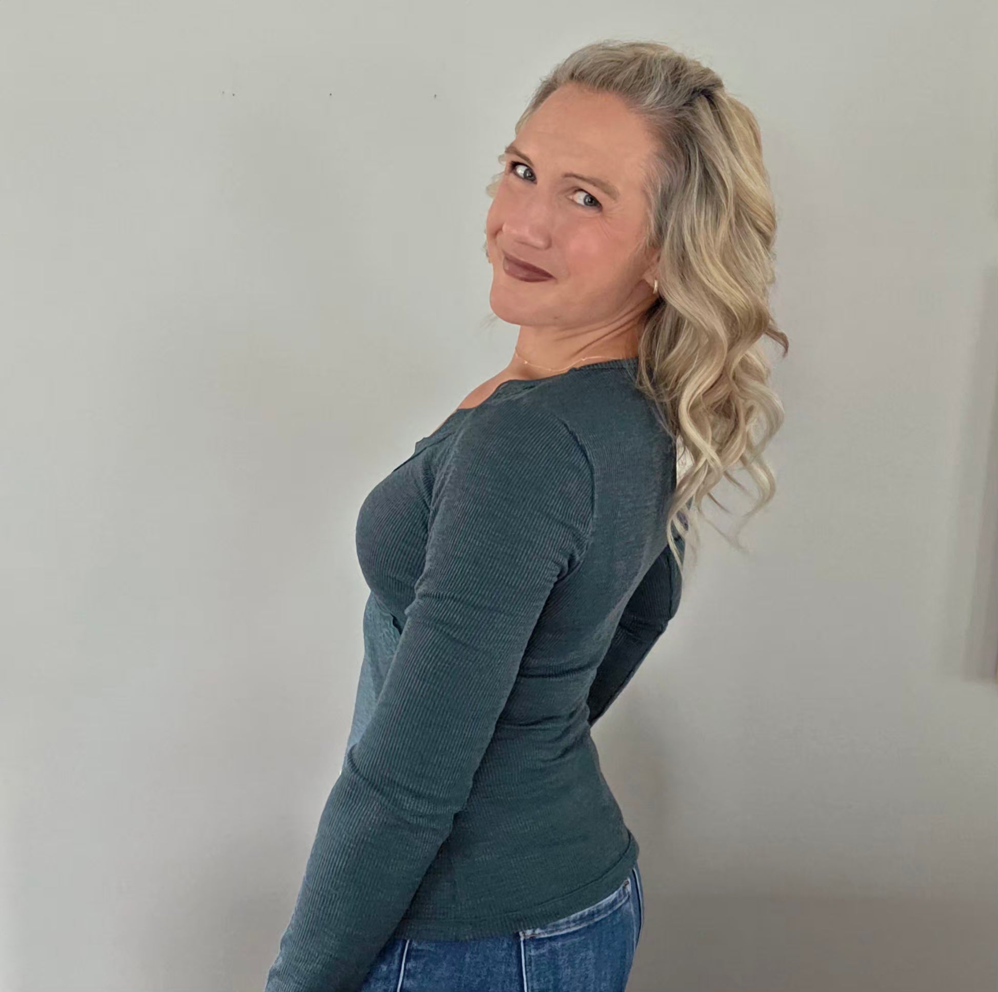 Lace trimmed v-neck top in forest green. Wearing a size small.