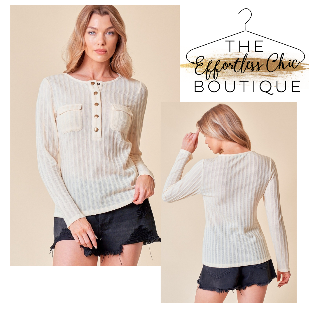 Ribbed long sleeve, henley top with front pockets & gold buttons.