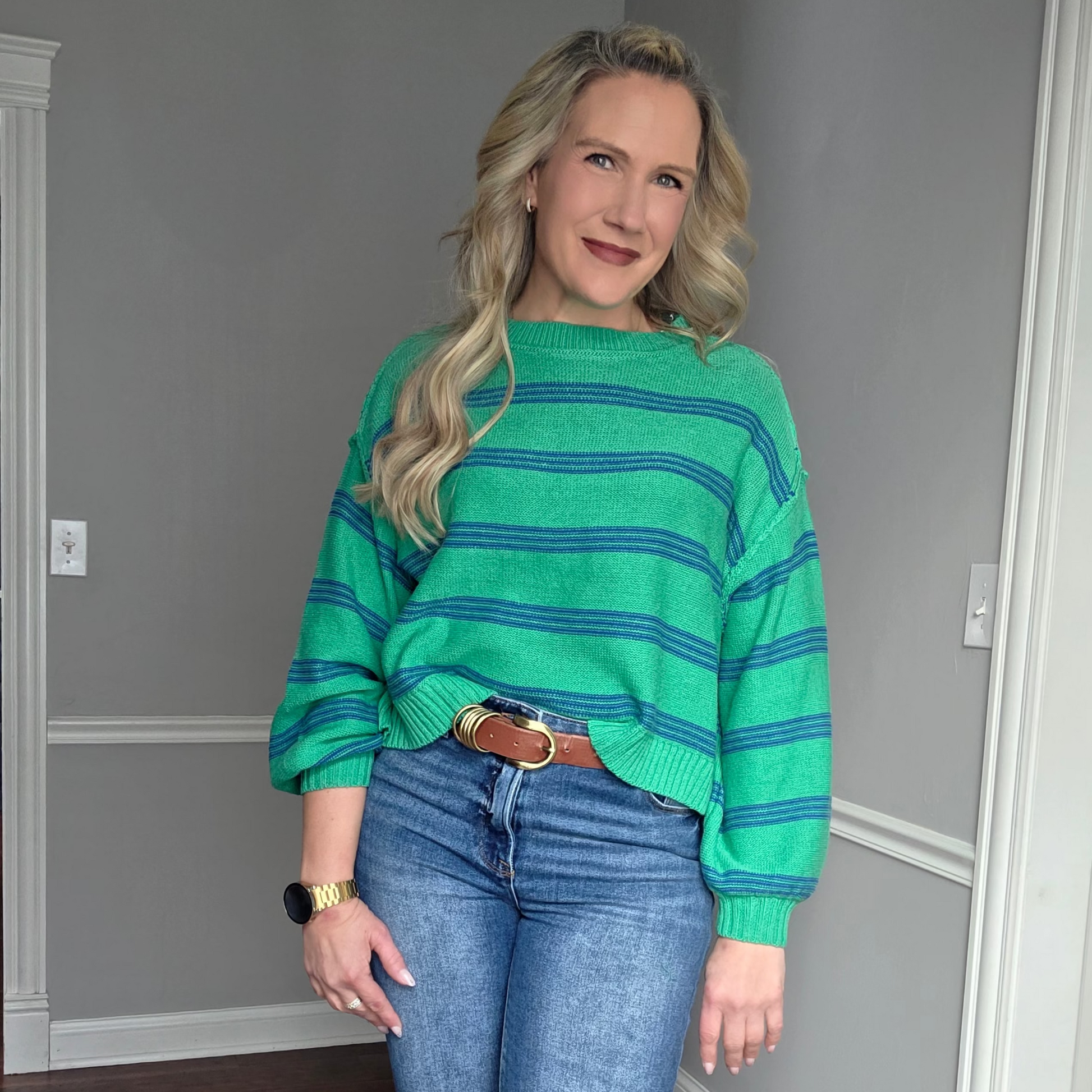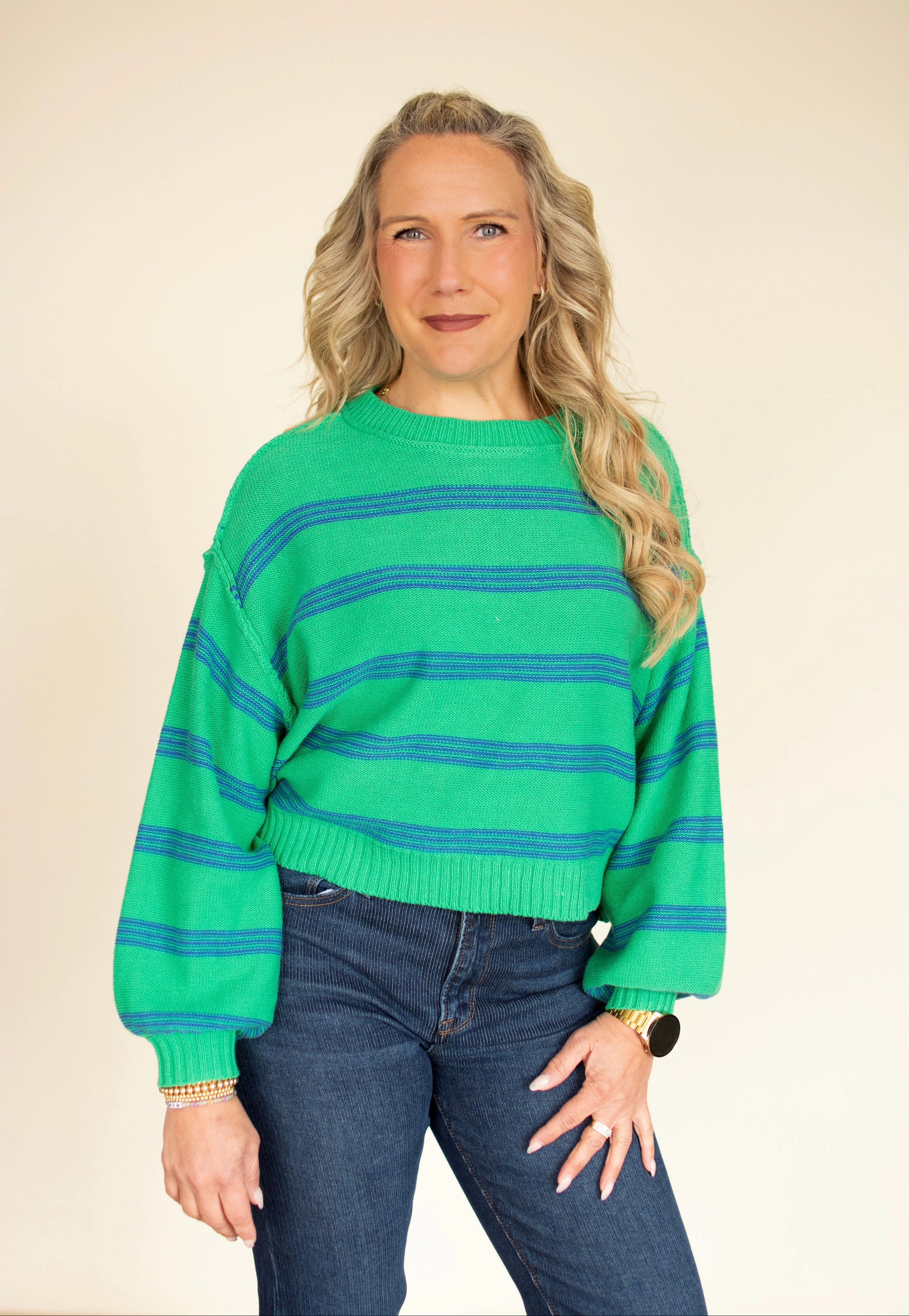 Effortlessly chic meets cozy comfort in this kelly green lightweight sweater that's ready for anything. Relaxed drop sleeves give you that laid-back vibe, while crisp navy stripes add a fun pop of contrast that plays beautifully with the rich green base. Perfect for layering over your favorite tee or wearing solo when the weather's just right. This is the sweater that makes getting dressed feel like a breeze—no fuss, all style.