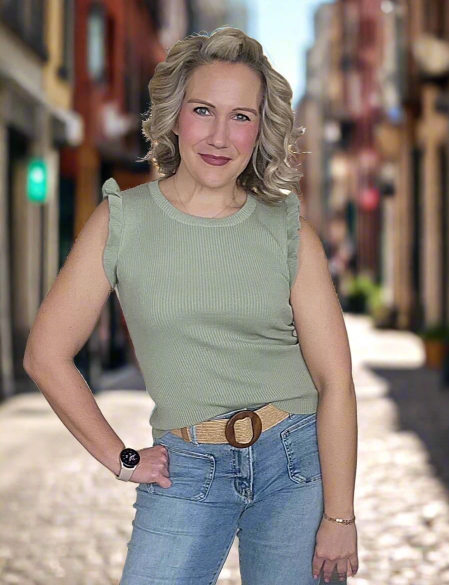Ribbed, sleeveless top with ruffles at shoulder. Crew neckline.