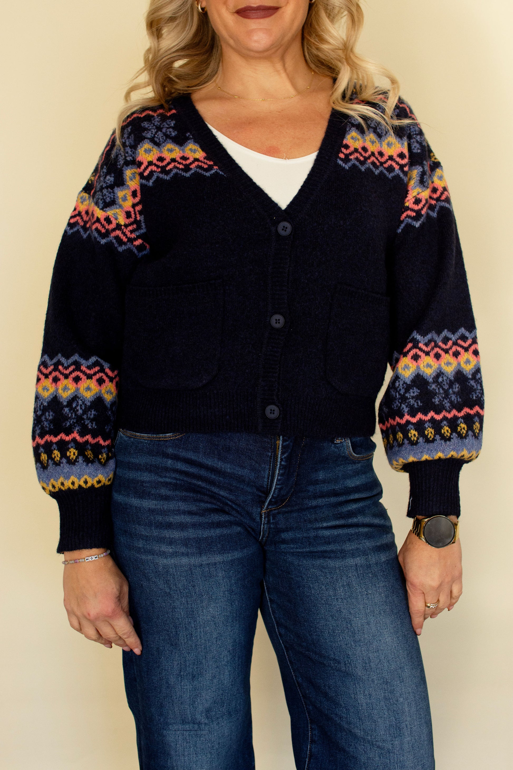 Embrace understated elegance with this navy fairisle cardigan, designed for effortless layering and everyday versatility. Crafted from a soft, stretchy fabric that moves with you, this button-front piece combines comfort with timeless Scandinavian style. Whether worn over a crisp white tee or your favorite dress, it transitions seamlessly from season to season. The relaxed fit and quality construction make it a wardrobe essential that works as hard as you do—without the fuss.