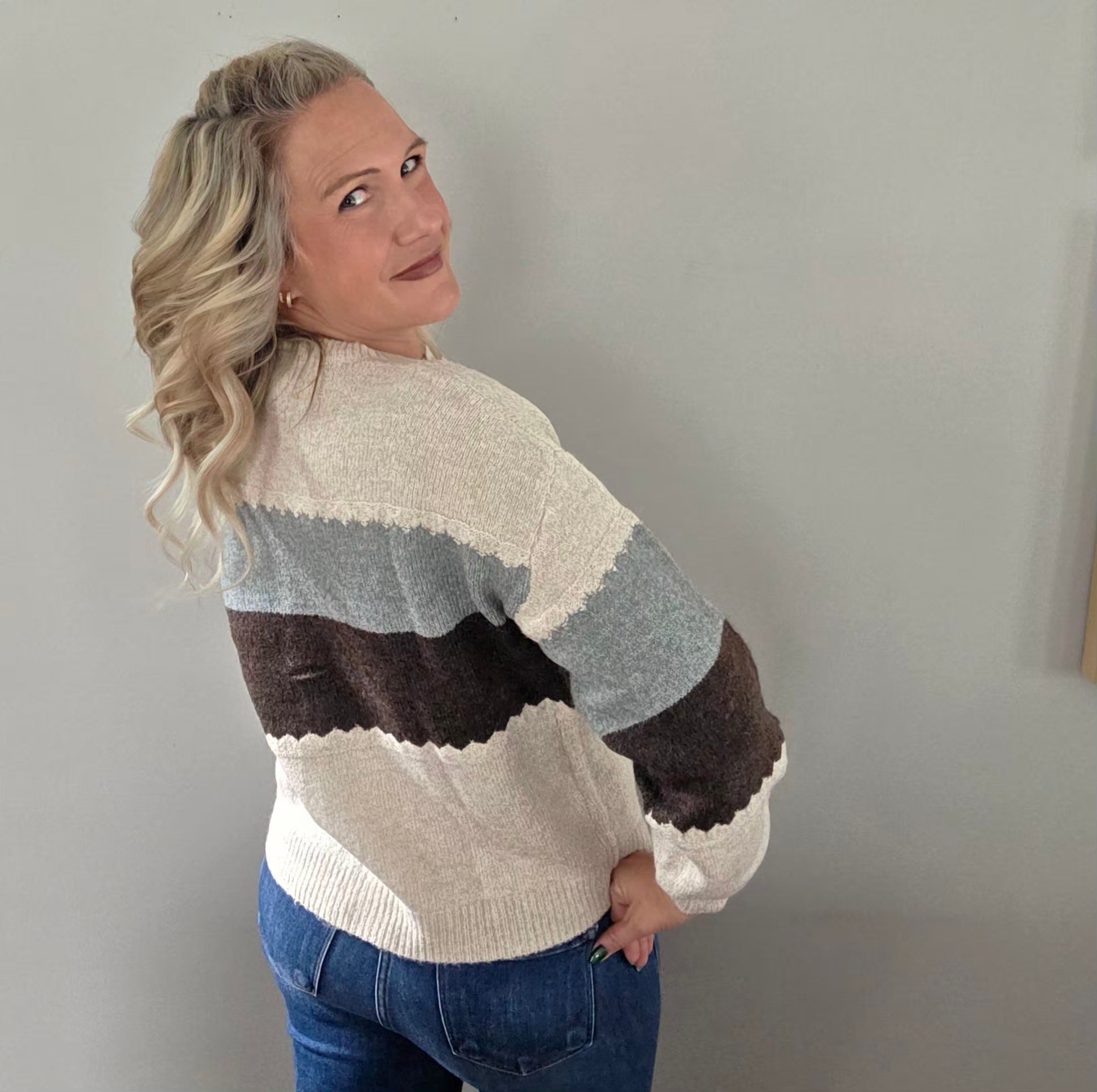 Oatmeal cardigan with blue and chocolate brown stripes and 3D rosettes. Super soft, very stretchy and comfortable. Easy to layer.