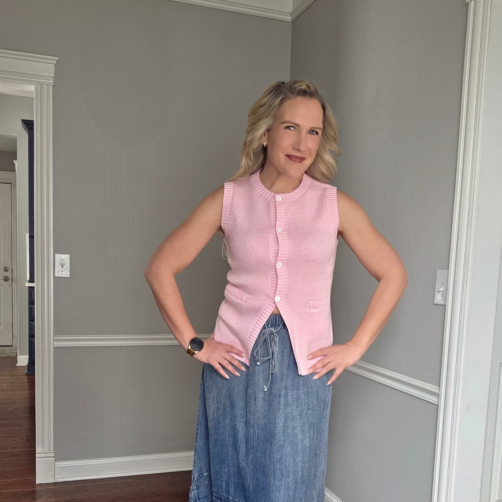 Say hello to the cutest layering essential! This delightful pink knit vest brings instant charm with its button-down front and relaxed crew neck. Slip your hands into the handy slit pockets—perfect for keeping little treasures close. The soft, breathable knit makes it ideal for year-round wear, whether paired with a crisp white tee or a cozy long-sleeve underneath. Pure playful perfection!
