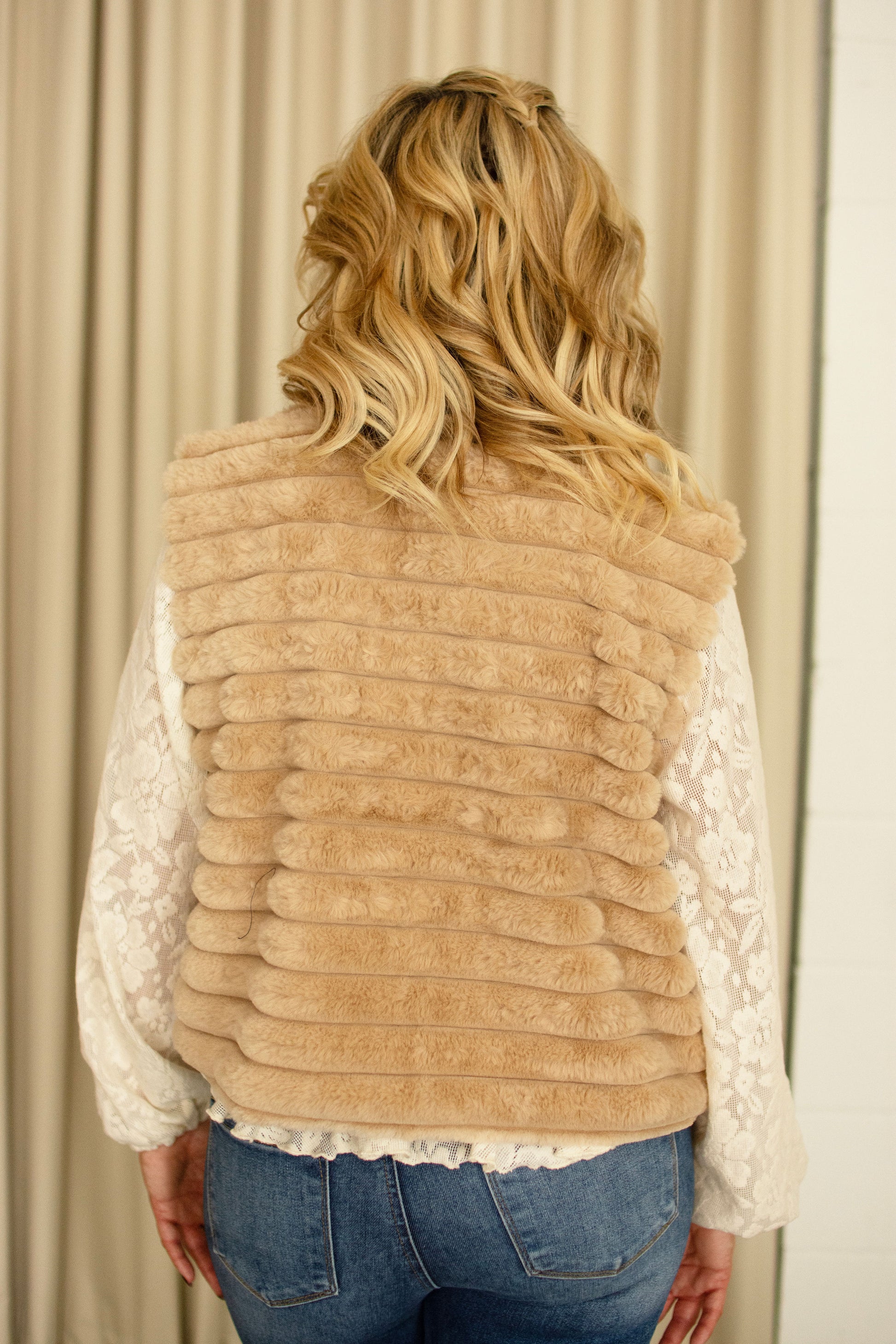 Beautiful taupe faux fur vest with a toggle closure. Perfect for layering over your favorite fall tops, dress or sweaters. Wearing a M.