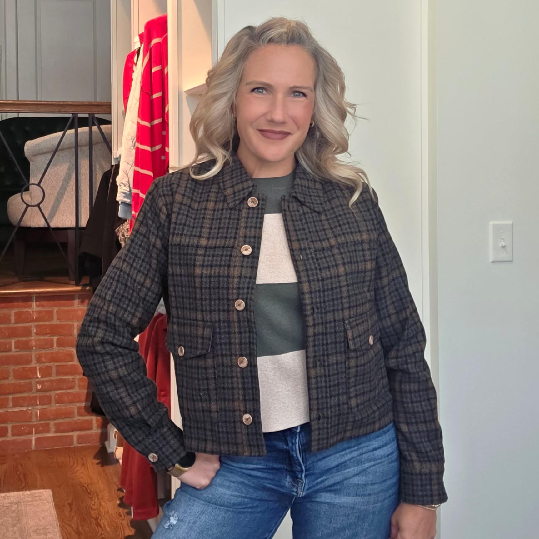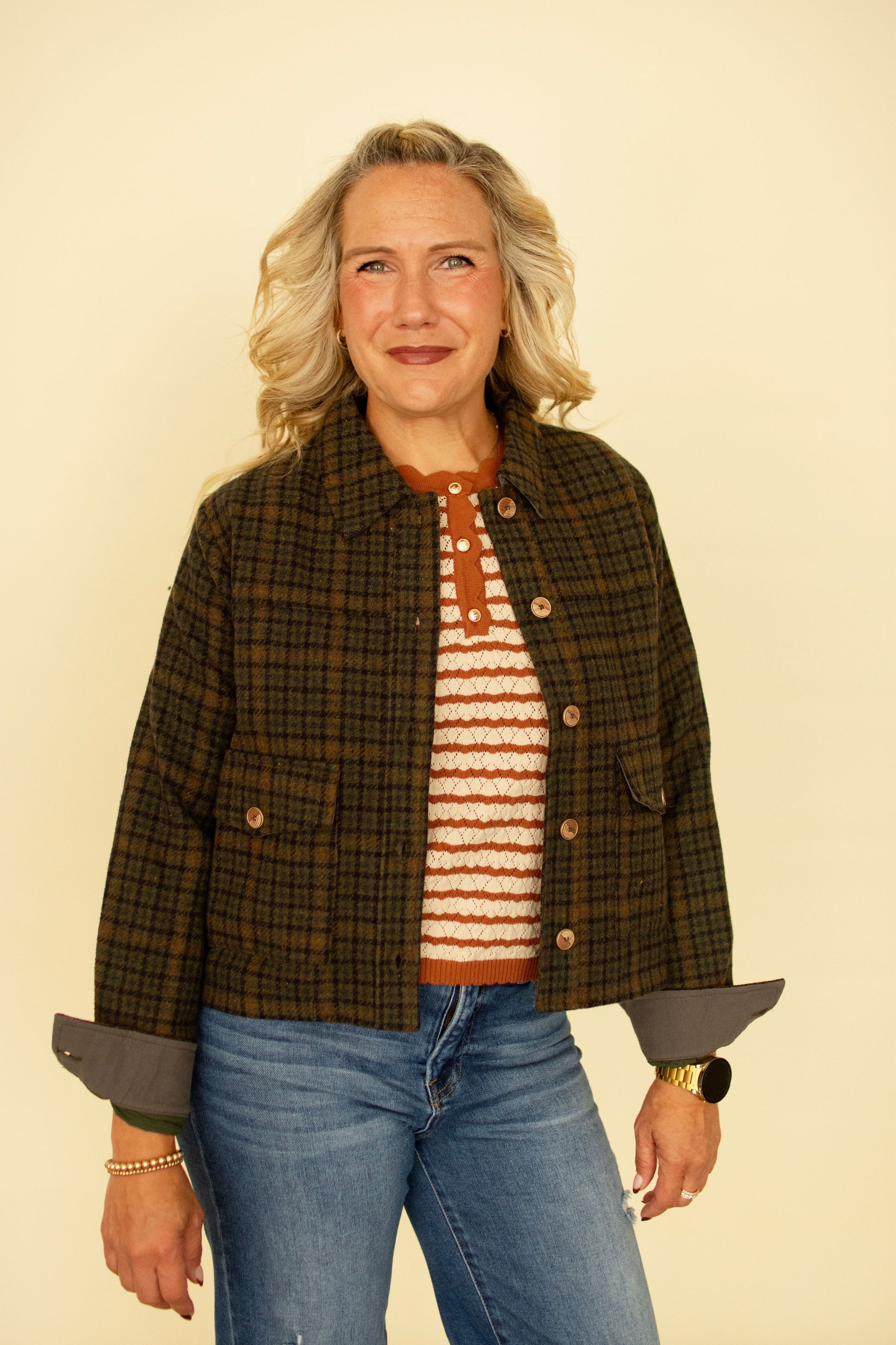 This adorable green, navy and yellow plaid jacket is perfect for Fall. The colors are gorgeous; the fit is perfect. Fully lined with adorable brown tortoise buttons outlined in gold. This jacket layers perfectly over all your favorite tops or sweaters.