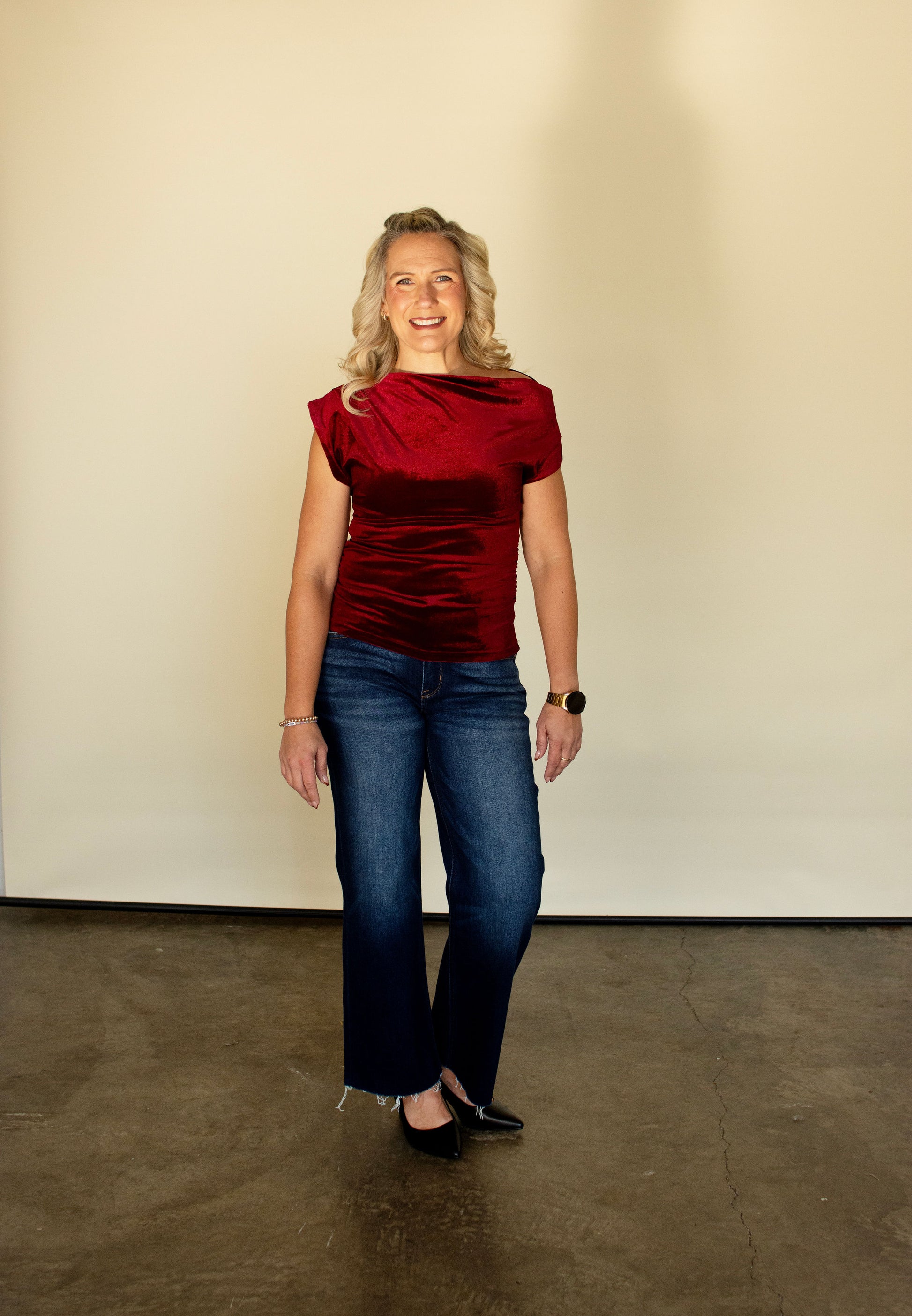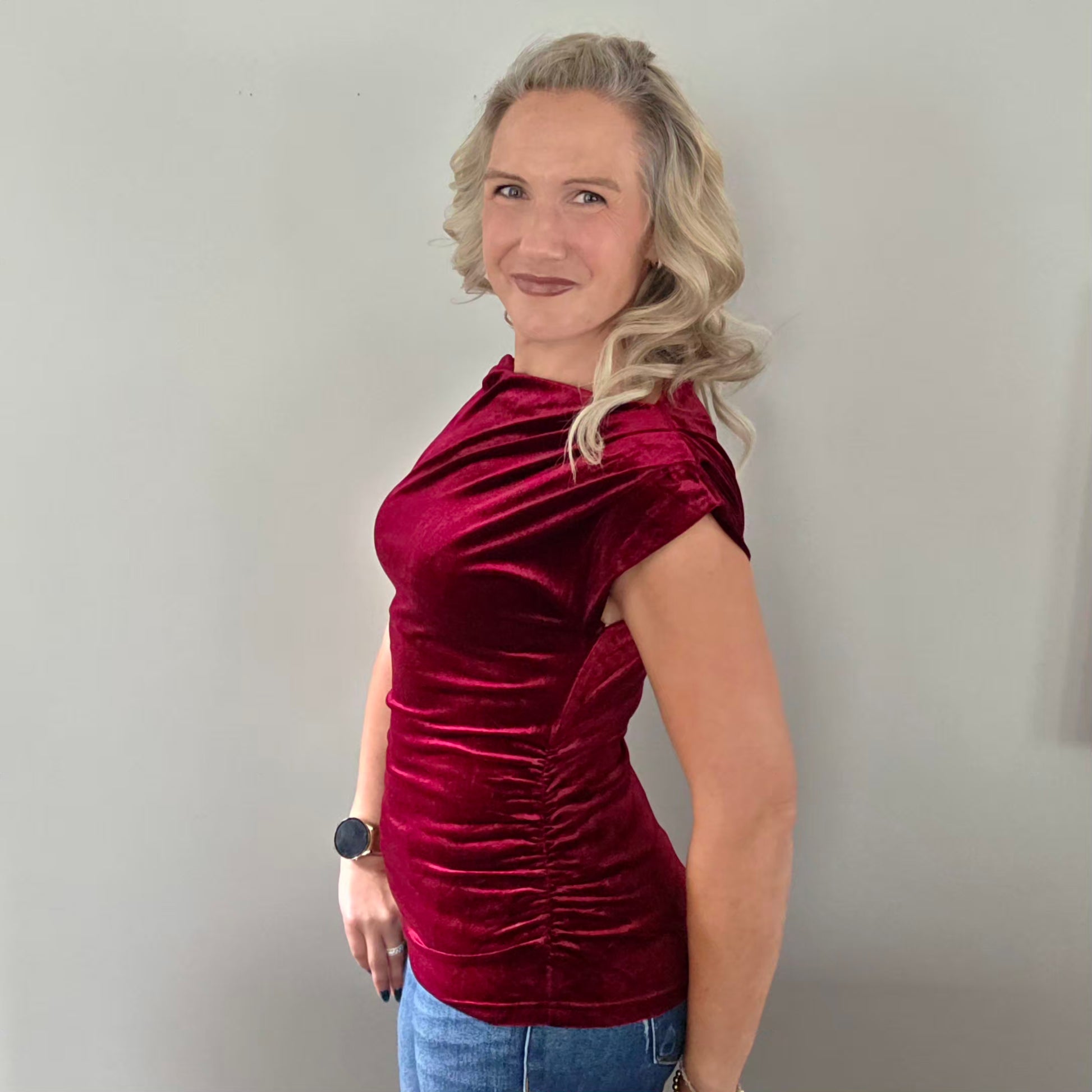 Elevate your wardrobe with this fitted velour top in a rich wine hue. Its flattering side ruching enhances your silhouette, while the elegant cowl neckline adds a touch of sophistication. Designed with short sleeves, this top offers both comfort and style, perfect for effortlessly chic looks any day.